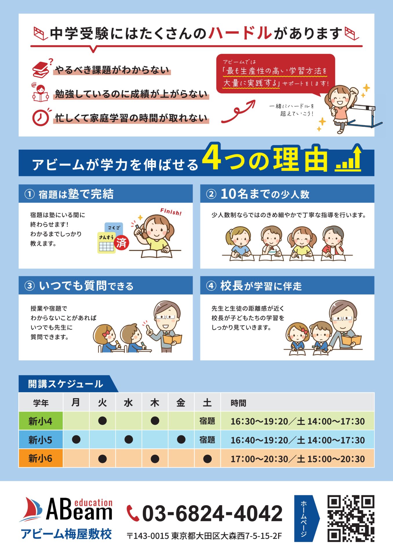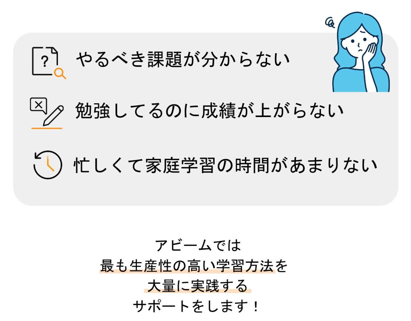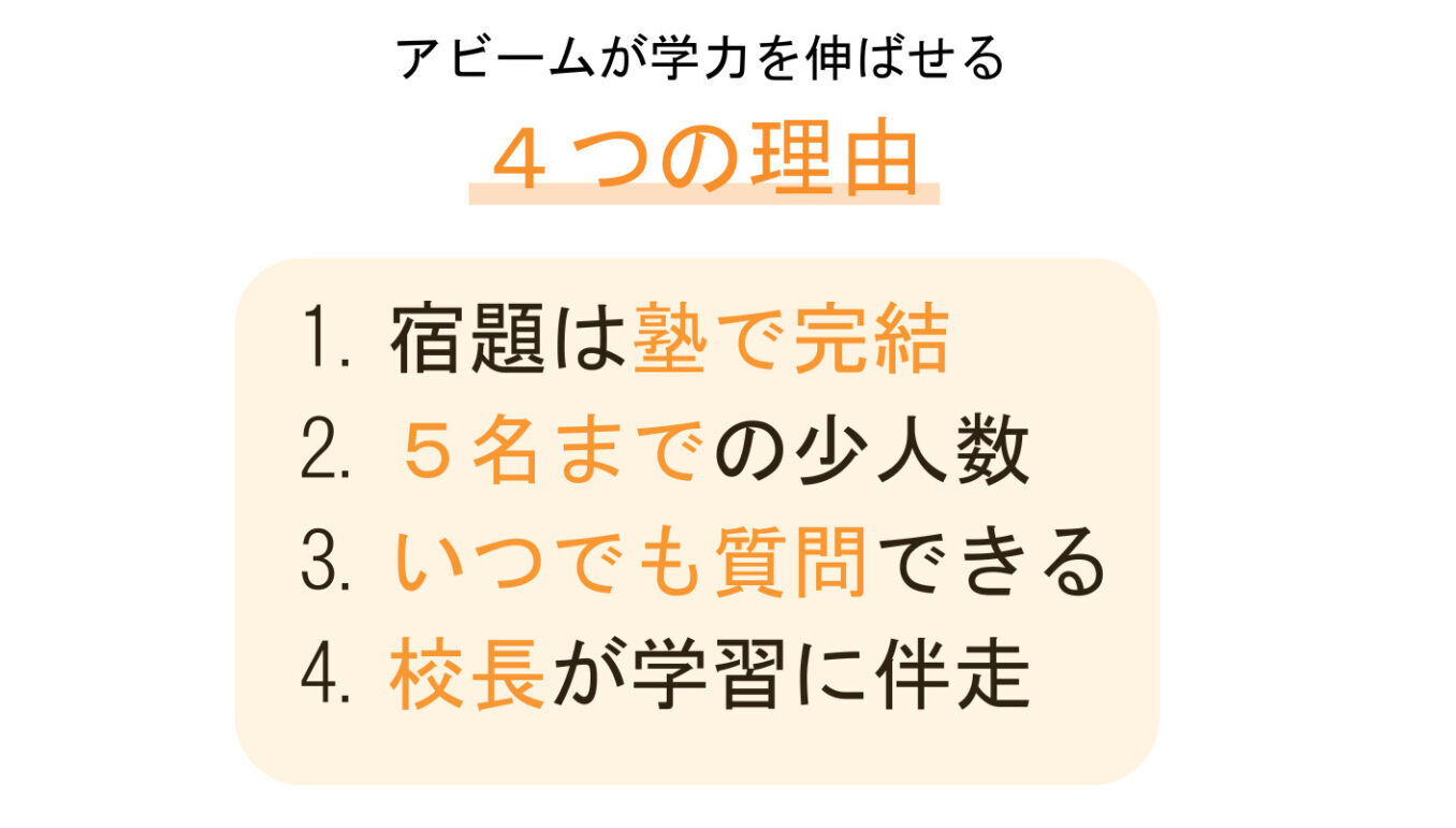 アビームの学習のほとんどが塾でスタッフと一緒に学習して完結するため、必ずやり遂げるが可能です。